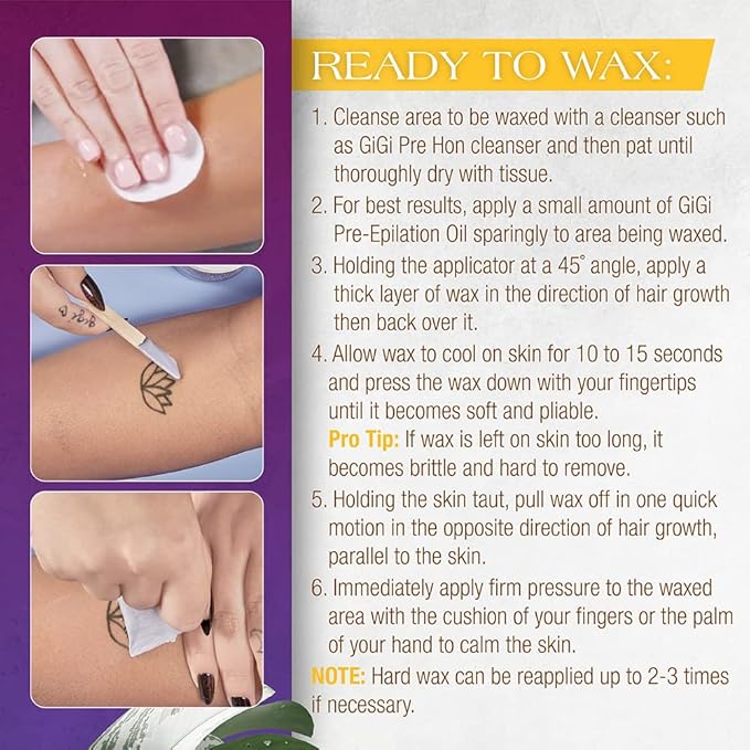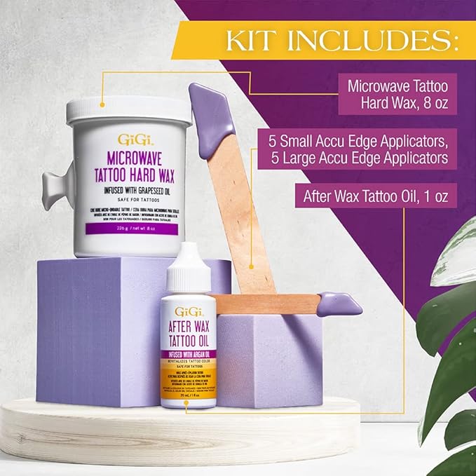 GiGi Microwave Tattoo Hard Wax + Essentials Kit je sveobuhvatan set za uklanjanje dlačica, posebno osmišljen za njegu tetovirane kože. Ovaj komplet omogućuje sigurno i učinkovito uklanjanje neželjenih dlačica, istovremeno revitalizirajući i naglašavajući boje vaših tetovaža.