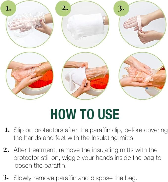 Parafinski zaštitnici za ruke i stopala namijenjeni su za korištenje tijekom parafinskih tretmana. Stavljaju se prije nego što ruke ili noge uđu u izolirane rukavice, štiteći kožu od parafina. Pogodni su za ruke i noge, a univerzalna veličina osigurava jednostavnu primjenu za svakog korisnika.